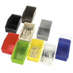 Praktisk, stabil och stapelbar besticklåda. Finns i åtta färger.