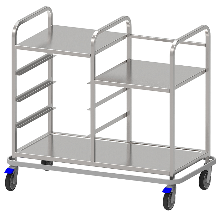 2 st. Långsidor med övervikt kant 30 mm bred samt 10 mm djup. Helsvetsat stativ av rostfria fyrkantsrör 20 x 20 mm, bassäng av 1,5 mm rostfri plåt. Försedd med 125 mm kullagrade länkhjul, varav 2 st. med broms. Avlopp: kulventil, anslutning Ø32 mm.
