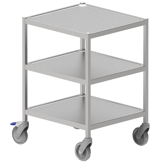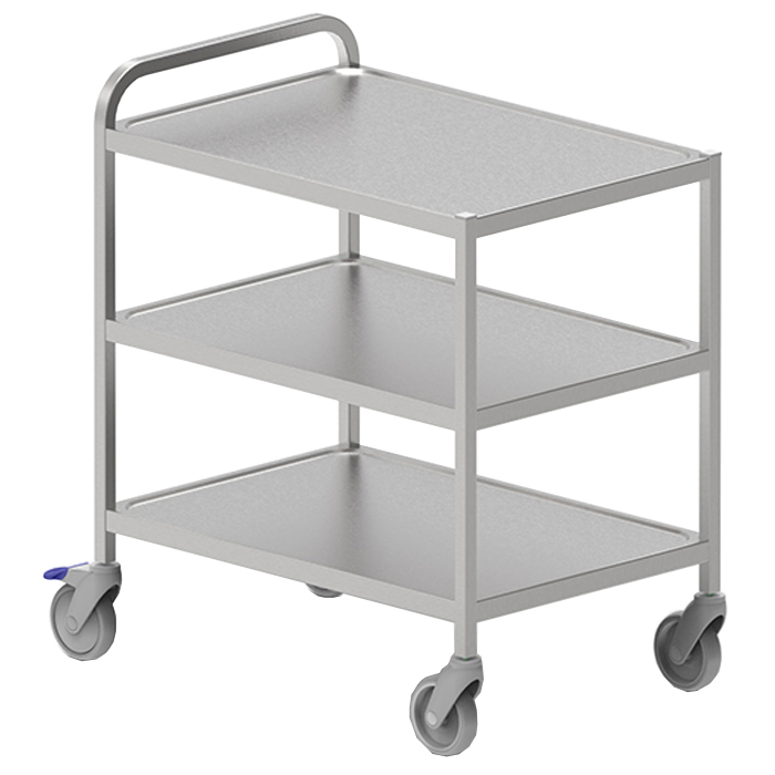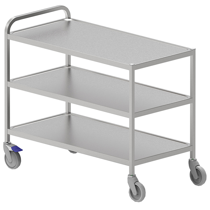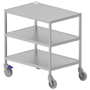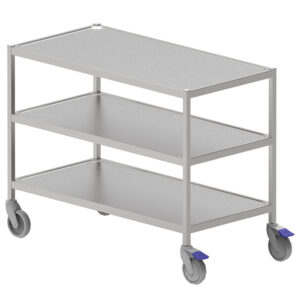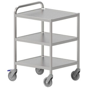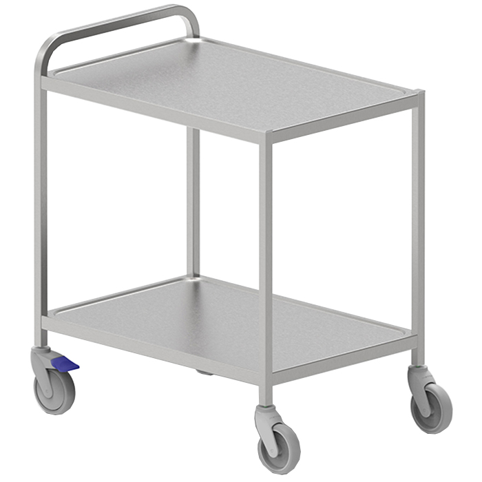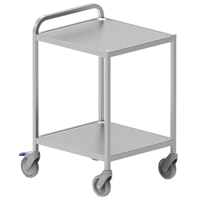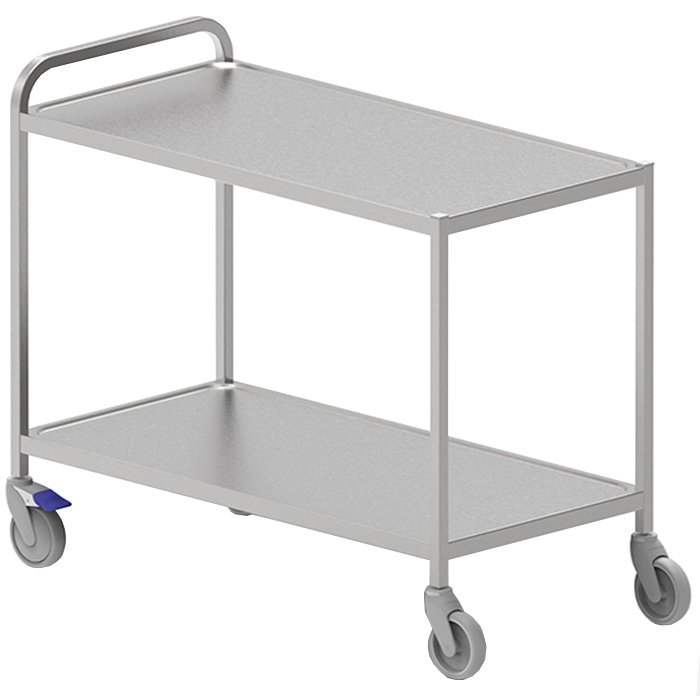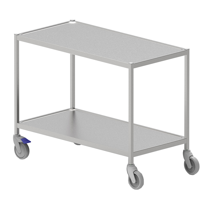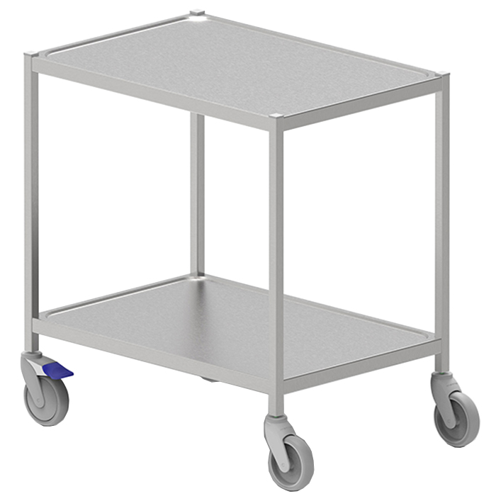 Monterad rörkonstruktion i rostfritt stål med två förstärkta vulstade hyllplan i rostfritt stål. Hyllplanen är även försedda med dämpmattor. Lättstyrd, försedd med 125 mm kullagrade länkhjul varav 2 st. med broms.