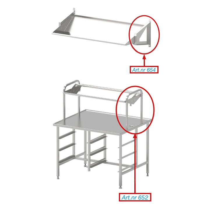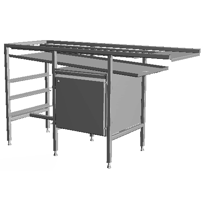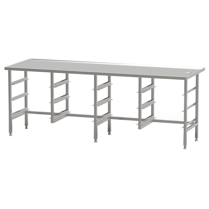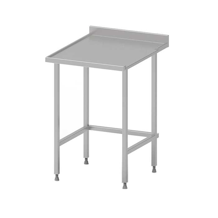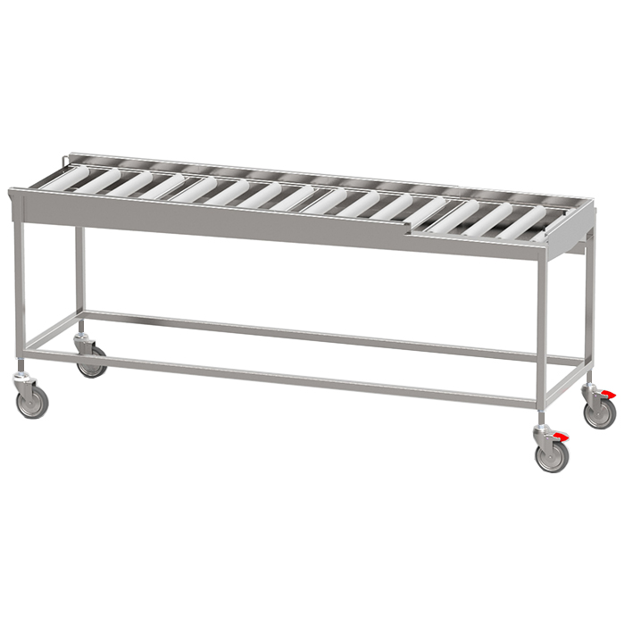 Konstruktion där korgen matas fram med friktionsdriven kedja. Fungerar för alla diskkorgar och diskmaskiner. Den är lätt att rengöra och har en balja i rostfritt stål samt stativ av rostfria fyrkantsrör på 30×30 mm med ställbara fötter.