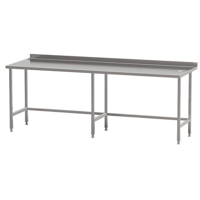 Bänkskiva i 1,25 mm rostfri plåt, ljuddämpad med dämpmatta, hög bakkant samt vulst av diskbänkstyp på tre sidor. Underrede av rostfria fyrkantrör 30×30 mm, ställbara fötter, helsvetsad konstruktion. Avloppsanslutning G 1 1/2” R.