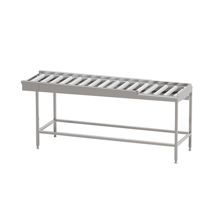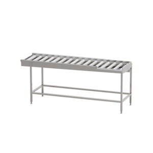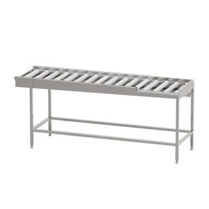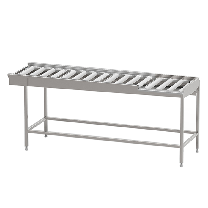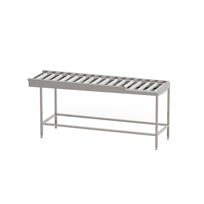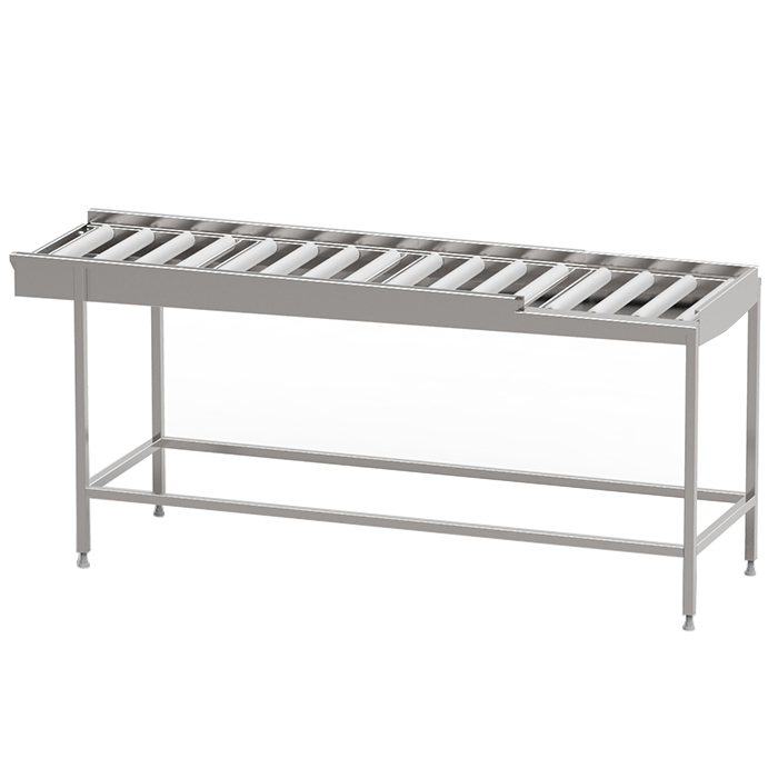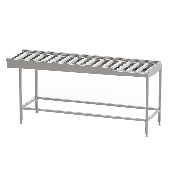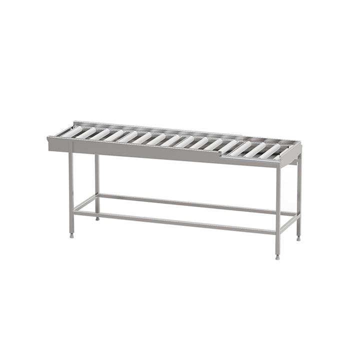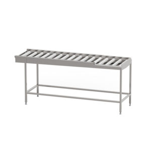 Robust torkbana med kullagrade rullar i löstagbara sektioner med avloppsanslutning G 1 1/2” R i bänkskivan för enklare rengöring. Sista sektionen är öppen mot användaren för att underlätta flytt av korg till korgvagn. Helsvetsad stomme i rostfritt stål med avlopp, ändlägesbrytare och ställbara fötter. Plats för 2-6 diskkorgar. Anpassad för tunneldiskmaskiner och 90° kurva.