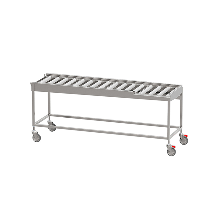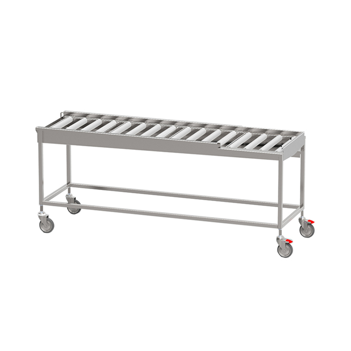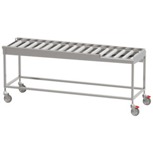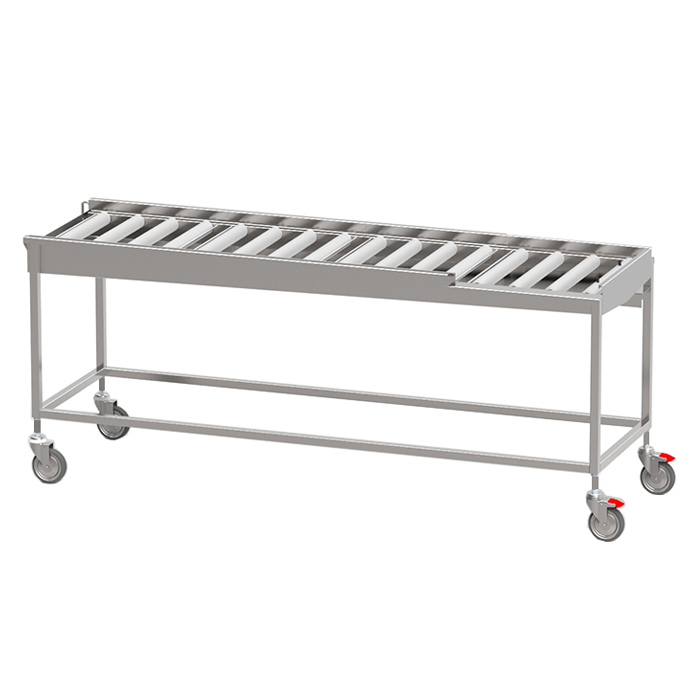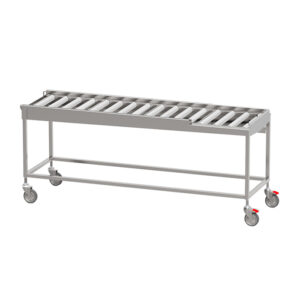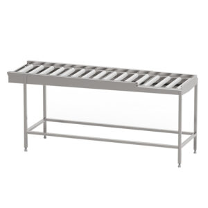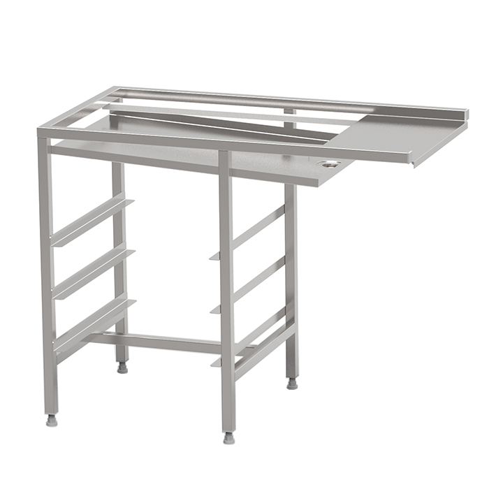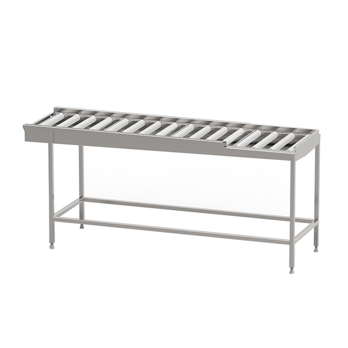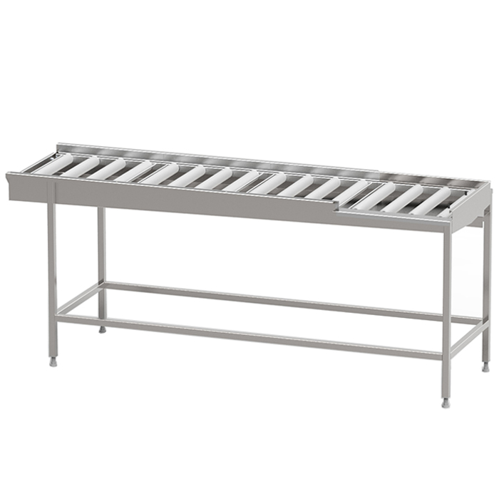 Robust torkbana med kullagrade rullar i löstagbara sektioner med avloppsanslutning G 1 1/2” R i bänkskivan för enklare rengöring. Sista sektionen är öppen mot användaren för att underlätta flytt av korg till korgvagn. Helsvetsad stomme i rostfritt stål med avlopp, ändlägesbrytare och ställbara fötter. Plats för 2-6 diskkorgar. Anpassad för tunneldiskmaskiner och 90° kurva.