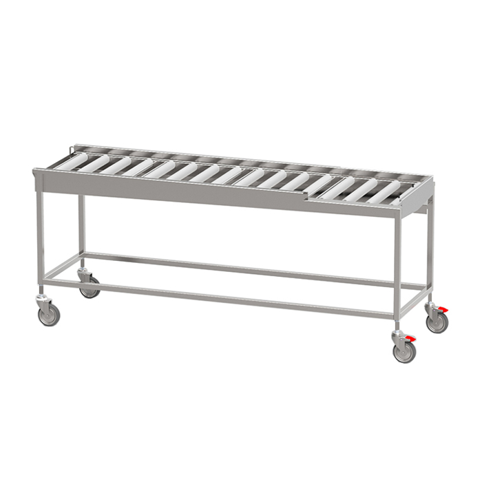 Torkbana med rullar för ackumulering och torkning av diskgods i diskkorg.